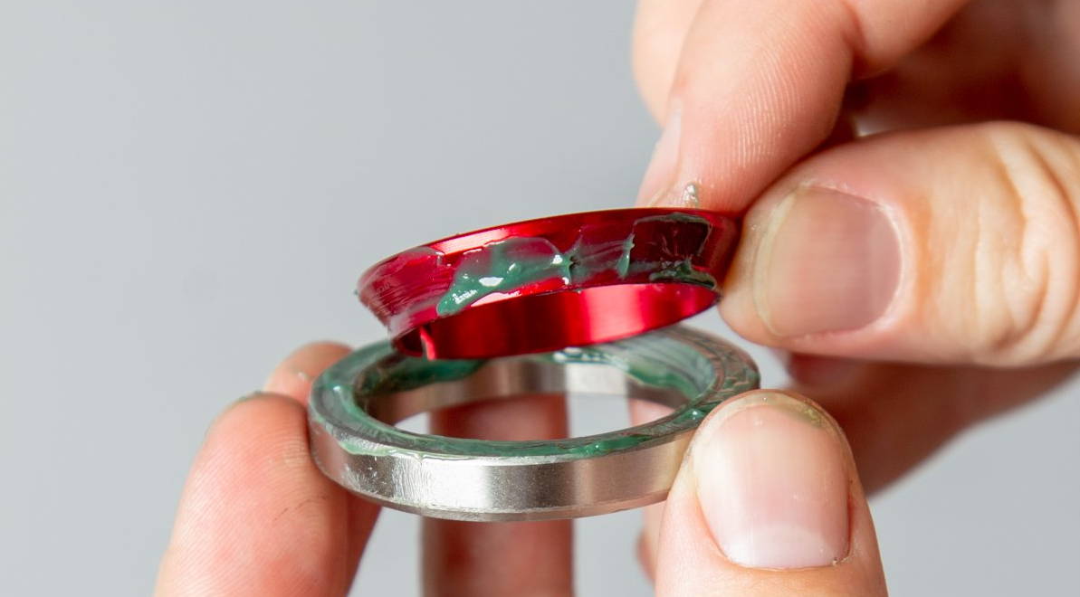 The (larger) lower bearing slides onto the steerer tube with the external chamfered edge facing upward. Make sure to grease both the chamfered edges and the outer edge of the bearing.
